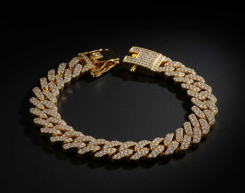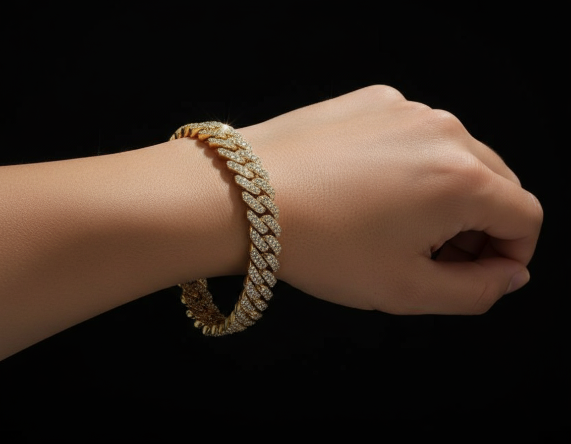 Fearless. Flashy. Unforgettable. The Gold Cuban Link Bracelet brings pure luxury energy to your wrist. With every link iced out in handset stones, this timeless Cuban design glows with bold confidence and undeniable presence. Crafted from premium stainless steel and finished in rich 18K gold tone, it’s built to turn heads — whether you’re at a party, on the grind, or just flexing your everyday fit.
